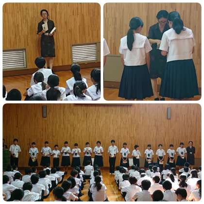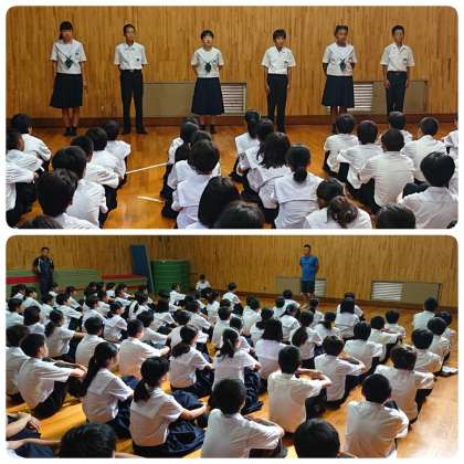 始めに、各クラスの男女委員長から、1学期を振り返ってのクラスの成果と課題、2学期に向けての学級目標について報告がありました。