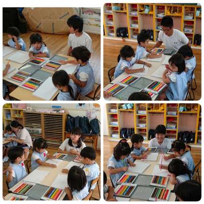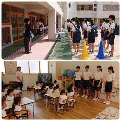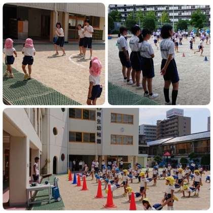 割り当てのクラスに分かれ、自己紹介に続いて、園児さんたちと触れ合いました。運動場では、運動会の練習です。