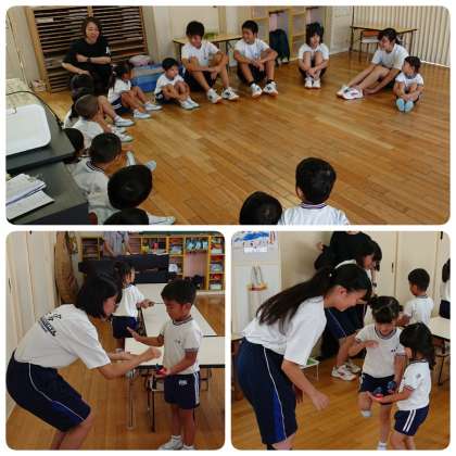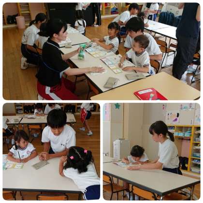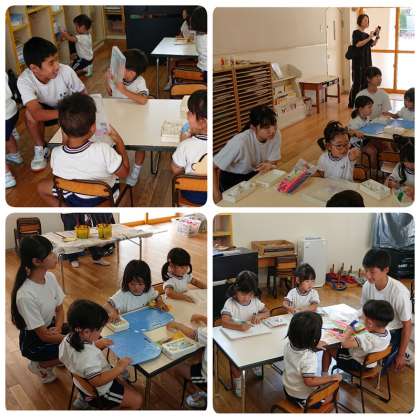 園児さんたちは、パズル遊びやカスタネットを使ったリズム遊び、ひらがなの練習にも取り組んでいました。