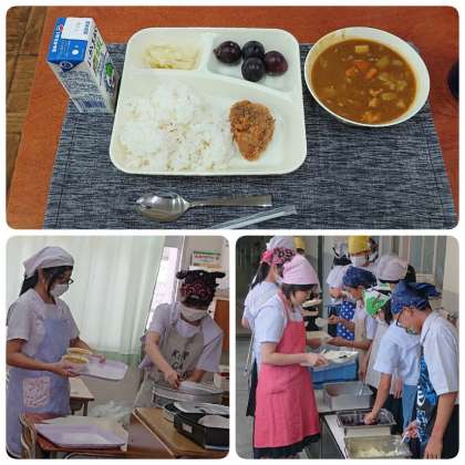 今日のメニューは、チキンカレーライス、一口ヒレカツ、キャベツのピクルス、ブドウ(巨峰)と牛乳です。