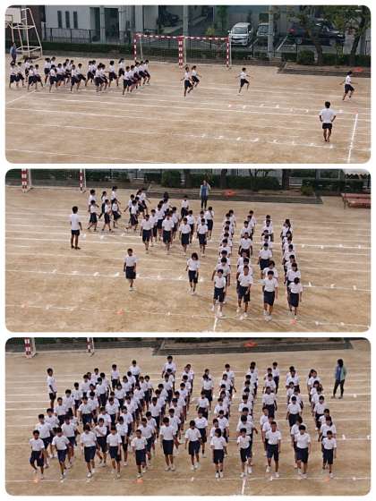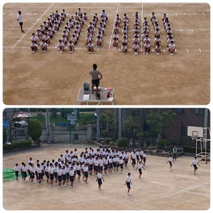 1年生は、男女合同で、本番を想定した体育大会の「開会式」「入場行進」「ラジオ体操」の練習を運動場で行いました。
