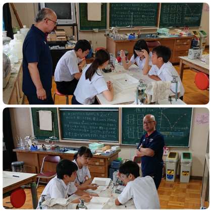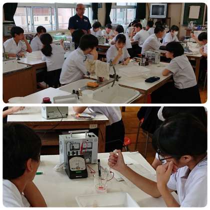 今日は理科室で「化学変化とイオン・酸性、中和におるイオン数の増減と電流値の関係」の実験です。
