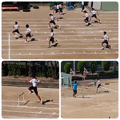 前半は各自が出場する個人種目の練習です。短距離種目に出る人はクラウチングスタートからダッシュの練習、長距離走に出る人はグランドの外側をランニング、ハードル走、走り幅跳び、ハンドボール投げも先生方の指導のもと、練習をしていました。