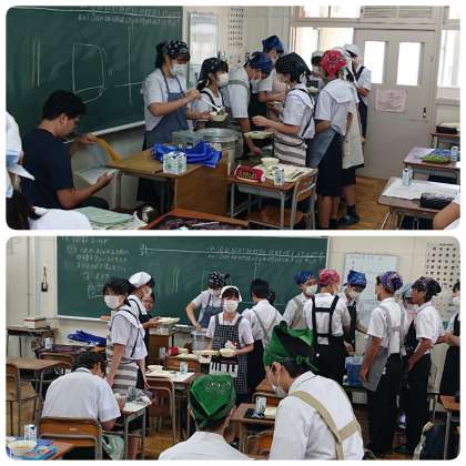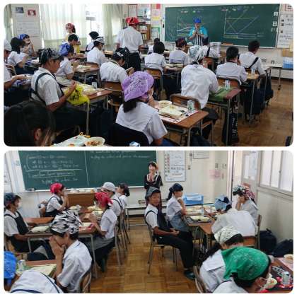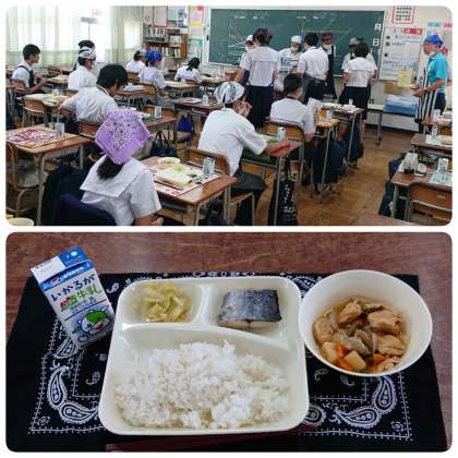 今日のメニューは、さごしの塩焼き、じゃがいもと一口がんもの煮物、キャベツのおひたし、ごはんと牛乳です。