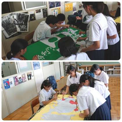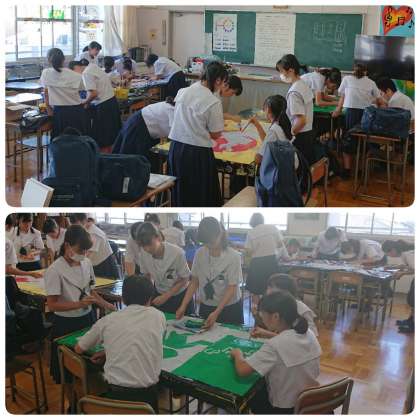 9月19日(木)放課後、2年生は美術室で学級旗づくりに取り組んでいました。