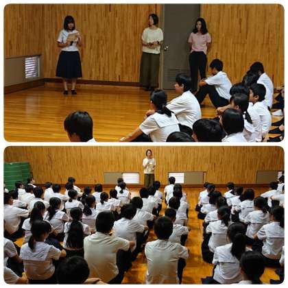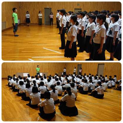 委員長の代表による司会で学年集会が始まりました。始めに、梅津先生から体育大会で行う集団行動の取組について話があり、続いて、学年主任の仲原先生から「大阪府育英会・奨学金貸付」について連絡がありました。申し込み締切は9月25日(水)です。