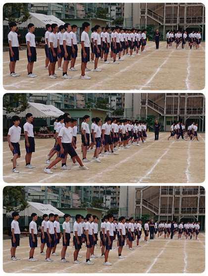 始めに集団行動の練習です。入場からの通し練習を行いました。2列からの3列変換、5列変換、7列変換、そして駆け足交差です。