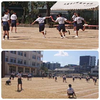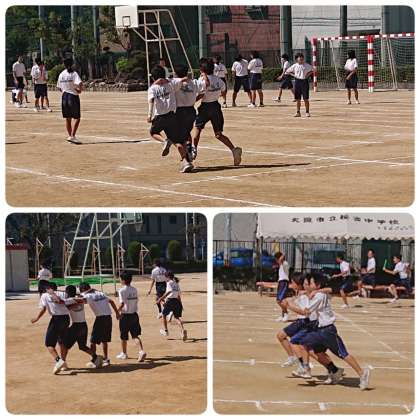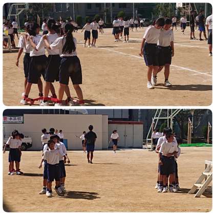 縄跳び走、二人三脚、三人四脚、ムカデ競争、リレーのバトンパスの練習に取り組みました。