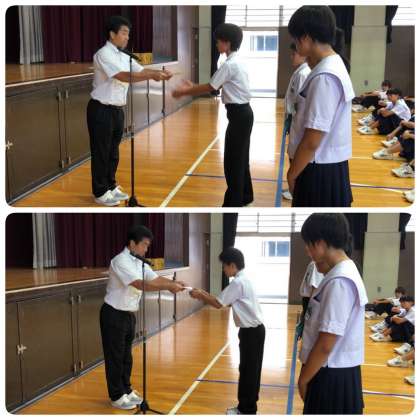 続いて、令和元年度後期生徒会執行部役員一人ひとりに認証書が学校長より手渡されました。