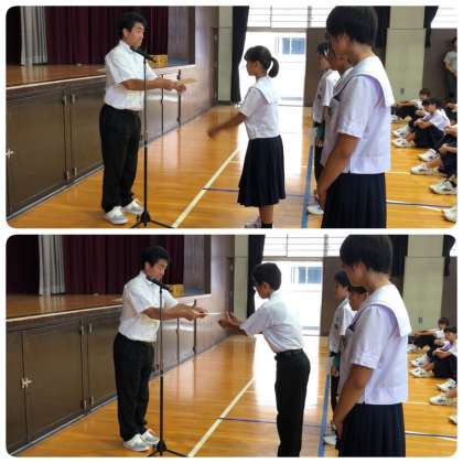 始めに、令和元年度前期生徒会執行部役員の一人ひとりから、半年間取り組んできた生徒会活動についての成果や感想、みんなへの感謝の気持ちなどについて話がありました。