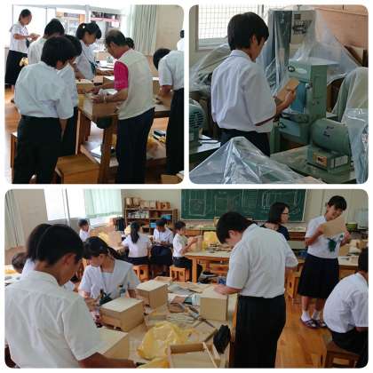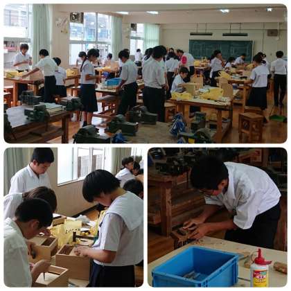 グループで協力しながら、金槌やカンナ、木工用ボンドなどを使い、慣れない手つきで一生懸命ものづくりに取り組んでいました。引き出しがスムーズに出し入れできるよう、電動のサンドペーパーも使っていました。完成品は、文化祭で展示される予定です。