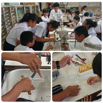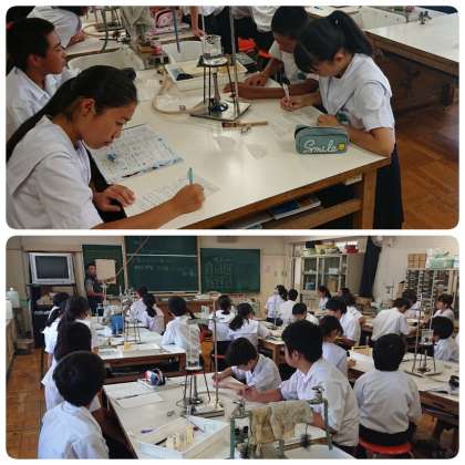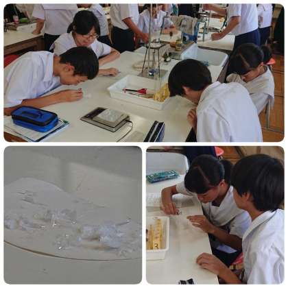 続いて、水に溶けた物質の取り出しです。硝酸カリウムが溶けた試験管を水で冷やし、硝酸カリウムの結晶ができるのを観察し、レポートにまとめていきました。