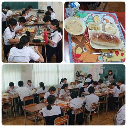 今日のメニューは、コーンクリームシチュー、白菜のピクルス、りんご、パンと牛乳です。