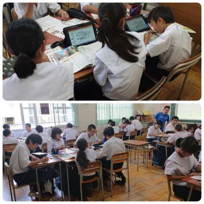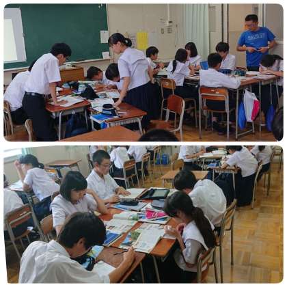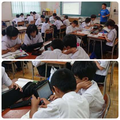 2・3人のグループでタブレットを使い、資料を読み取り、ワークシートに自分たちの考えをまとめていました。