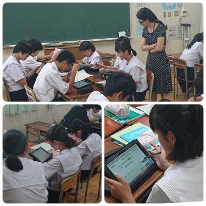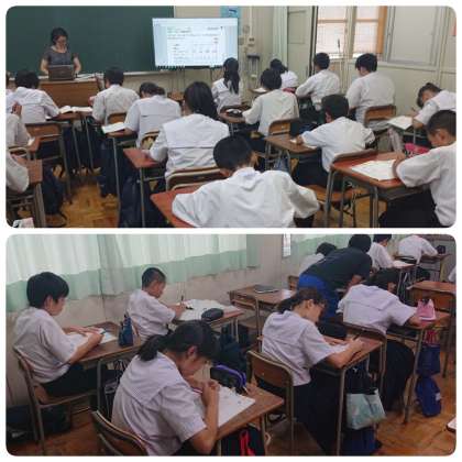 タブレットを使ってドリル問題に取り組んだ後、今日は「リスニング・スピーチを聞き取ろう」の授業です。電子黒板のデジタル教科書を使って、リスニング問題に取り組んでいました。