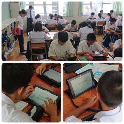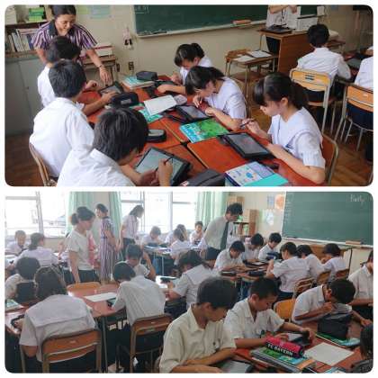 今日もタブレットを使ってドリル問題に取り組みました。3年生英語科担当の山口先生も授業に入って、子どもたちにアドバイスをしていました。後半は電子黒板のデジタル教科書を使って授業に取り組んでいました。