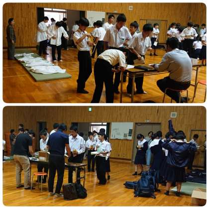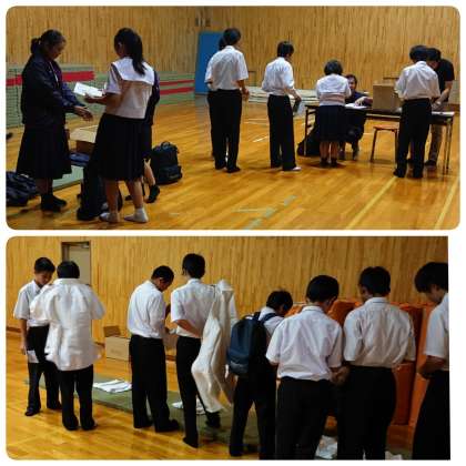 10月10日(木)テスト終了後、本校指定の防寒着と保健体育科の授業で使う柔道着(男子のみ)の採寸と購入申込みを武道場で行いました。