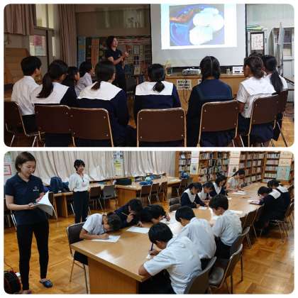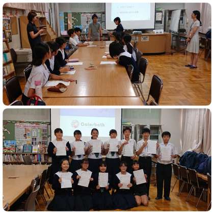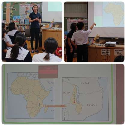 次に、交流の相手国となる「マラウイについて知ろう」と、国際青年協力隊としてマラウイで活動していた椎木さんからスライドを観ながら説明がありました。クイズ形式で進められ、マラウイの位置、国の様子、人々の生活や暮らし、子どもたちの様子などについて、実体験をもとに話していただき、子どもたちも積極的に回答していました。