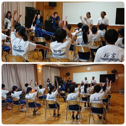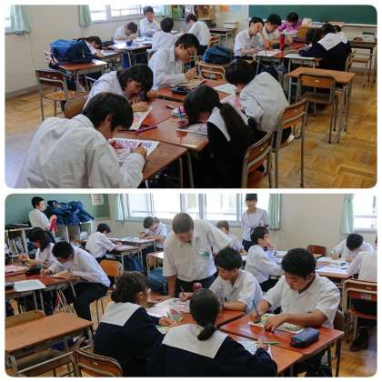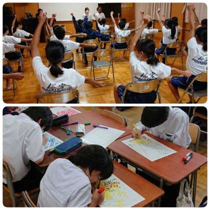 10月15日(火)6時間目、ラインダンスチームは多目的室でリーダーを中心に練習、モザイクアートチームは教室で担任や副担任の先生方と一緒にカラーマジックを使って色塗り作業に取り組んでいました。