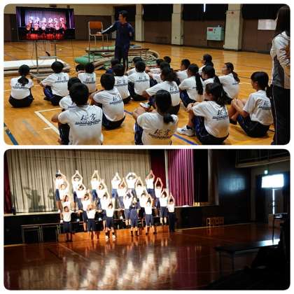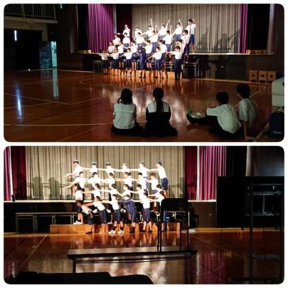 グループ練習のあと舞台で全体練習に取り組みました。自分たちの動きを動画に撮り、電子黒板で確認しながら練習に取り組んでいました。