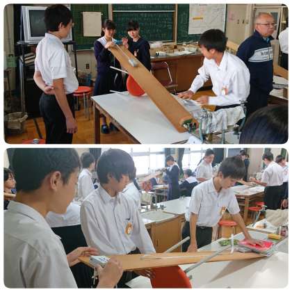 力学台車と記録タイマーを使い、水平面と斜面の台車の速さについて調べ、台車にはらたく力について学習していました。