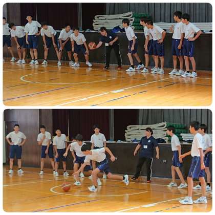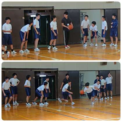 10月16日(水)2時間目、2年2・3組男子の保健体育の授業の様子です。2年生の男子は体育館でバスケットボールの授業です。