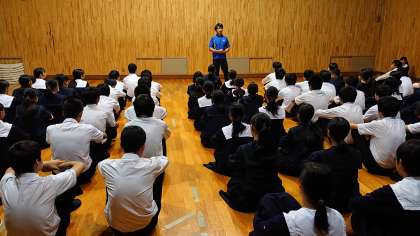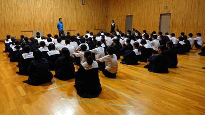 続いて、委員長の代表による司会で学年集会が始まり、川西先生から、文化祭の学年劇「未来〜輝くために−『意志と表象としての世界』より−」の台本に込められた思いについて話がありました。