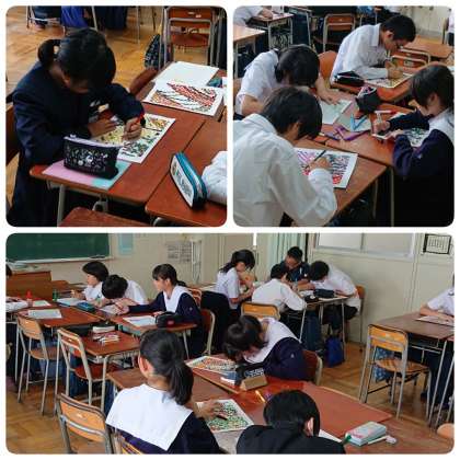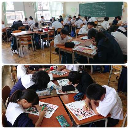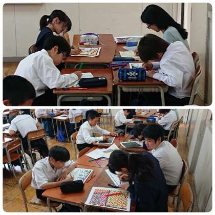 モザイクアートチームは、担任の先生方の指導のもと、教室で作業に取り組んでいました。細かい作業をコツコツと続けています。