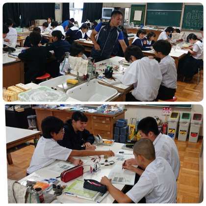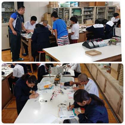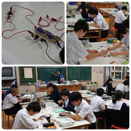 10月19日(土)2時間目、2年1組の理科の授業は理科室で電気の流れ、直列回路・並列回路の実験です。小学生も一緒に混じって考えていました。