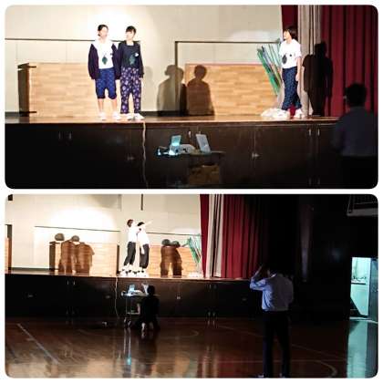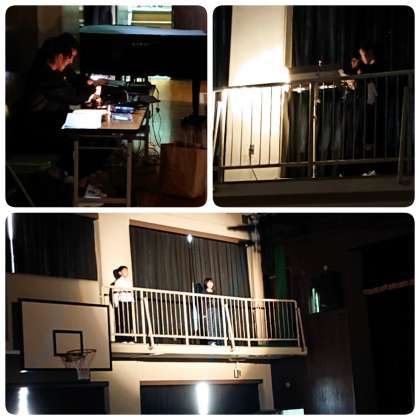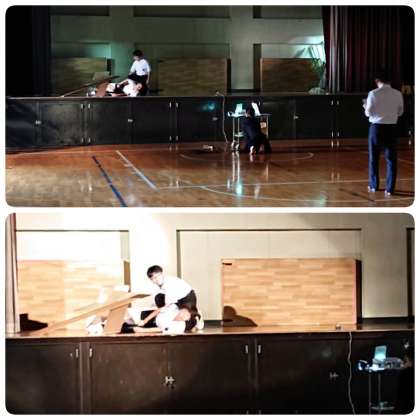 10月23日(土)5時間目、舞台チームは体育館で練習です。山口先生、玉村先生の指導のもと、照明、音響も練習に取り組んでいました。