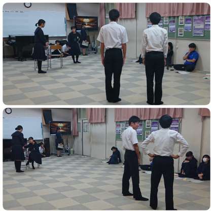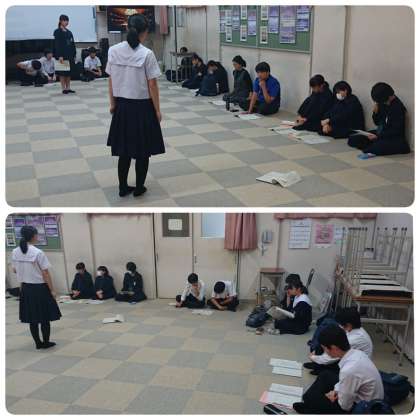 10月23日(水)5・6時間目、劇のキャストと照明・音響担当は音楽室で川西先生の指導のもと舞台の練習、ダンスチームは武道場で心斎橋のダンススタジオ・スタジオAXのインストラクターChika-Jさん指導のもとで最後の仕上げです。