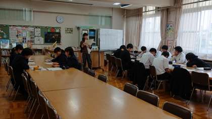 教室と図書館に分かれての少人数分割授業です。高校入試を想定した作文の書き方について、きめ細かい授業に取り組んでいました。