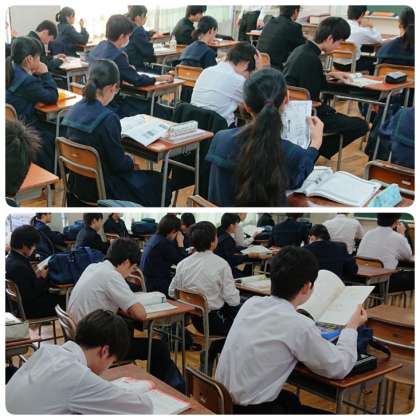 金曜日は3年学年集会の日ですが、3年生は各教室で朝早くからテストに向けて自主学習に取り組んでいました。