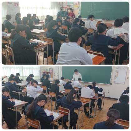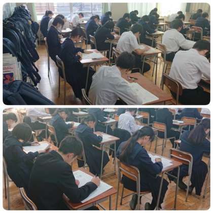 8時35分にテスト問題が配布され、8時40分から1時間目・社会のテストが始まりました。この後、2時間目・国語、3時間目・理科、4時間目・英語、給食を挟んで5時間目・数学のテストが行われます。進路決定に向け重要なテストとなるため、3年生は真剣にテスト問題に向かっています。