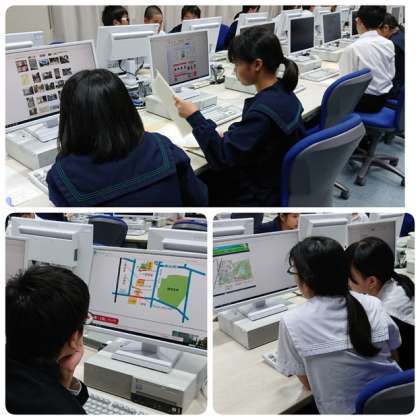 1組はパソコン教室でインターネットに接続し、見学施設の場所や学習できる内容などについて、班で協力しながら調べていました。