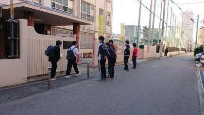 毎週水曜日は、インターンシップで本校に実習に来ている大阪成蹊大学教育学部2回生の3名も加わって、子どもたちに「おはよう」の声掛けをしています。