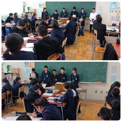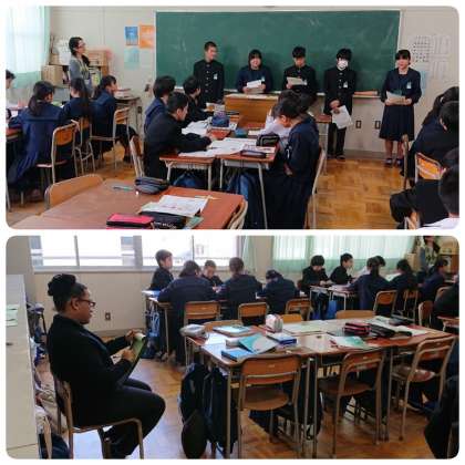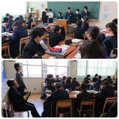 班ごとに考えた英語による自己紹介・学校紹介の発表練習に取り組んでいました。各班の発表をC−NETのニッキー先生もチェックしていました。