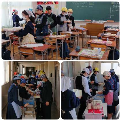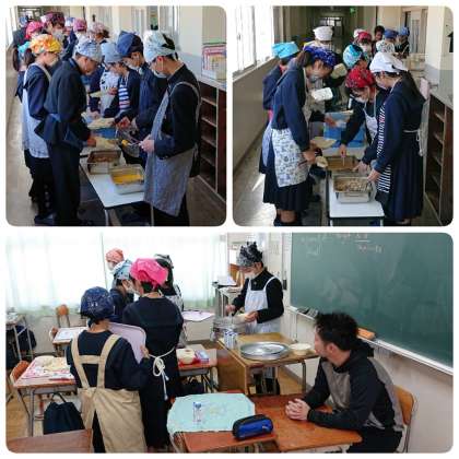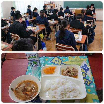 今日のメニューは、豚肉とまいたけの炒め物、つみれ汁、かぼちゃういろう、焼きのり、ごはんと牛乳です。