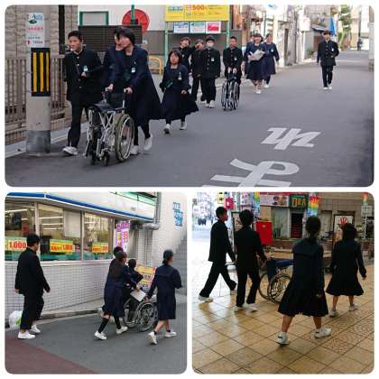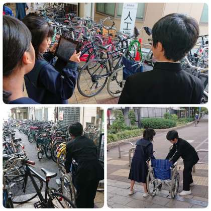 各クラス6班に分かれ、班ごとに車いす1台、タブレット1台を持って学校を出発しました。フィールドワークのテーマは、「わが町『京橋』バリアフリー・ユニバーサルデザイン調査」です。