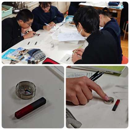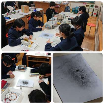 理科室で「磁石の性質とはたら」の学習です。棒磁石の上に鉄粉を巻き、その模様を調べる実験と、棒磁石のまわりに方位磁石を置き磁針が指す方向を調べる実験を行っていました。