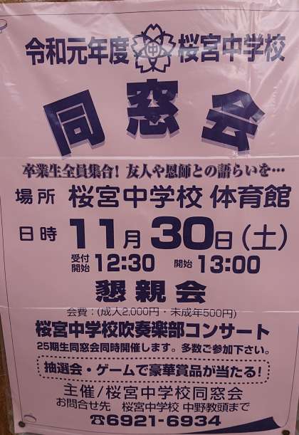 11月30日(土)午後1時より、本校体育館において、令和元年度桜宮中学校同窓会が開催されます。