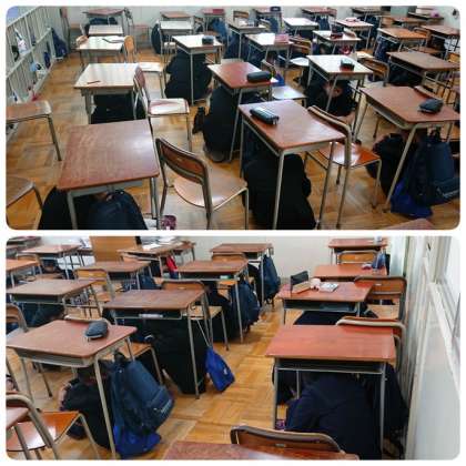 地震発生と同時に机の下に隠れ、頭部を守る訓練を行いました。続いて、津波警報が発令され、3年生は2階の教室から3階廊下に避難しました。