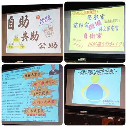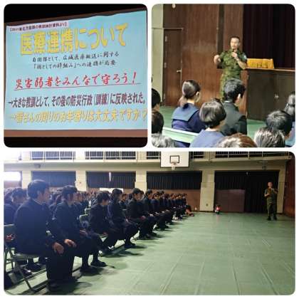 地下鉄サリン事件や福島原発災害の救助現場の実態を詳しく聴かせていただきました。続いて、警察や消防、自衛隊の救助は必ず来るが時間がかかる、自助、共助が重要であり、中学生である皆さんは、ご近所にお年寄りはいないか、体の不自由な方はいないか、常の心に留め、避難が必要になったら、手助けしてほしいと話されました。
