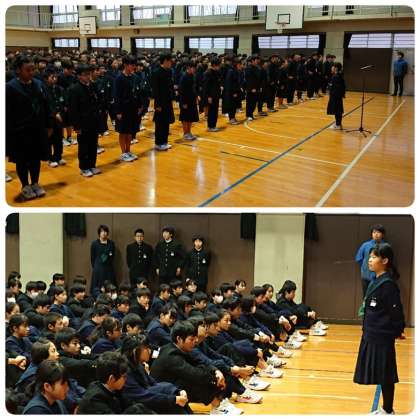 生徒会執行部役員の代表が集合・整列の指揮をとり、全校集会が始まりました。