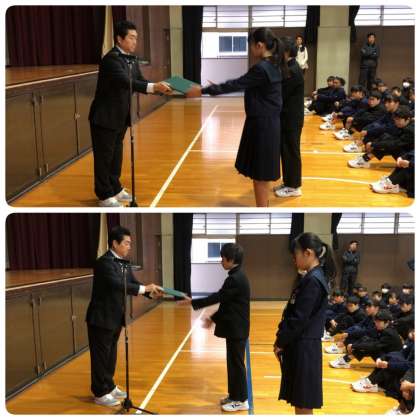 始めに、「奥の細道ゆかりの小松」PR実行委員会主催の「第8回小松ビジュアル俳句コンテスト」で入選した1年生の宇都野さん、松井君に表彰状が授与されました。