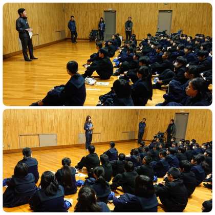 始めに、武道場に集合し、学年主任の西村先生から今日、学習する内容について説明がありました。続いて、特別支援学級担当の留山先生から車いすのサポートの仕方、目に障がいのある人へのサポートの仕方について説明がありました。