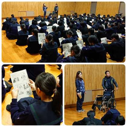 12月6日(金)5・6時間目、1年生は人権学習の取組として、車いす体験、アイマスク体験を行いました。
