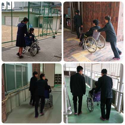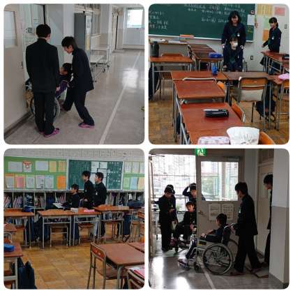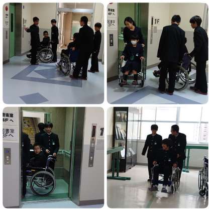 武道場から運動場に出て玄関から校舎内へ戻り、エレベーターで3階へ、スロープを使って1年1組の教室へ移動、障害物や机で作った狭い通路を通りながら、再度エレベーターで武道場に戻るコースを1周しました。