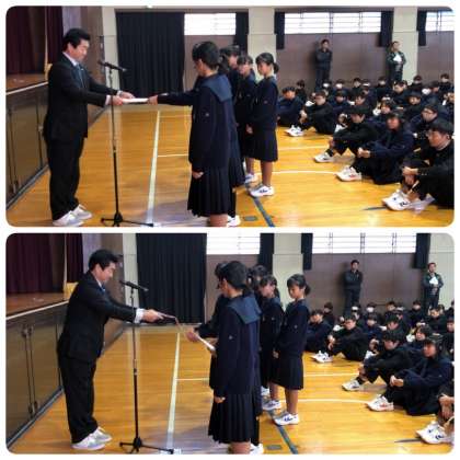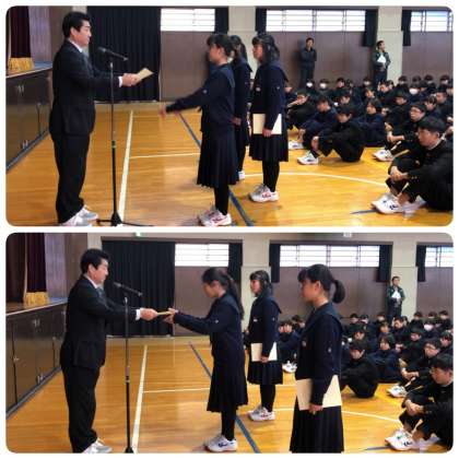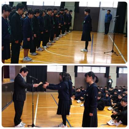 始めに、第17回大阪市立中学校アンサンブルフェスティバルにおいて管打八重奏・金賞、金管八重奏・銀賞、管打七重奏・銅賞に輝いた吹奏楽部に学校長から表彰状が授与されました。