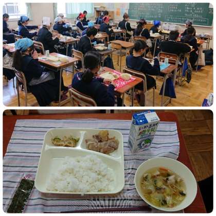今日のメニューは、焼き肉、五目汁、きゅうりともやしのおひたし、焼きのり、ごはんと牛乳です。